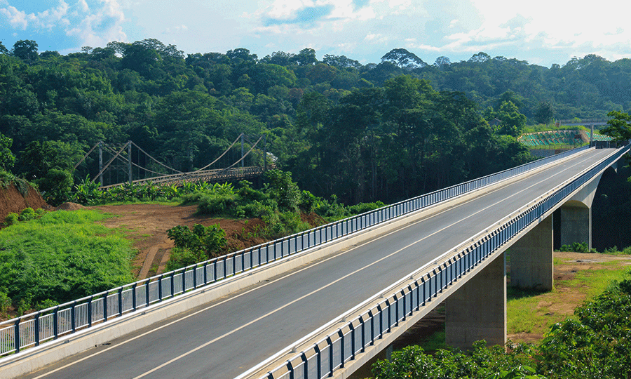 尼喀邊境大橋起點尼日利亞境內,止點喀麥隆境內,項目全長1500M,共分為三部分:尼日利亞境內引道長300M;喀麥隆境內引道長880M;橋梁為5跨預應力混凝土連續箱梁橋408M。項目于2017年4月26日開工,2022年11月3日完成竣工交付。