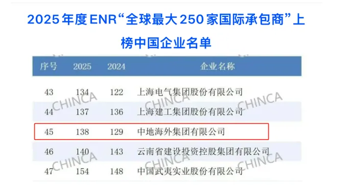 當地時間8月21日,美國《工程新聞紀錄(ENR)》發布2025年“全球最大250家國際承包商”榜單。中地海外集團有限公司連續20年入圍榜單,2025年排名第138位。