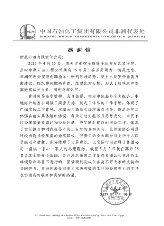 新星公司收到中國石化集團非洲代表處的感謝信,感謝新星所屬中地海外埃塞公司在中國石化集團中原石油工程公司駐蘇丹工作人員撤離過程中給予的全力配合和支持,對參與協助撤僑工作的同志給予了充分認可和高度贊揚。