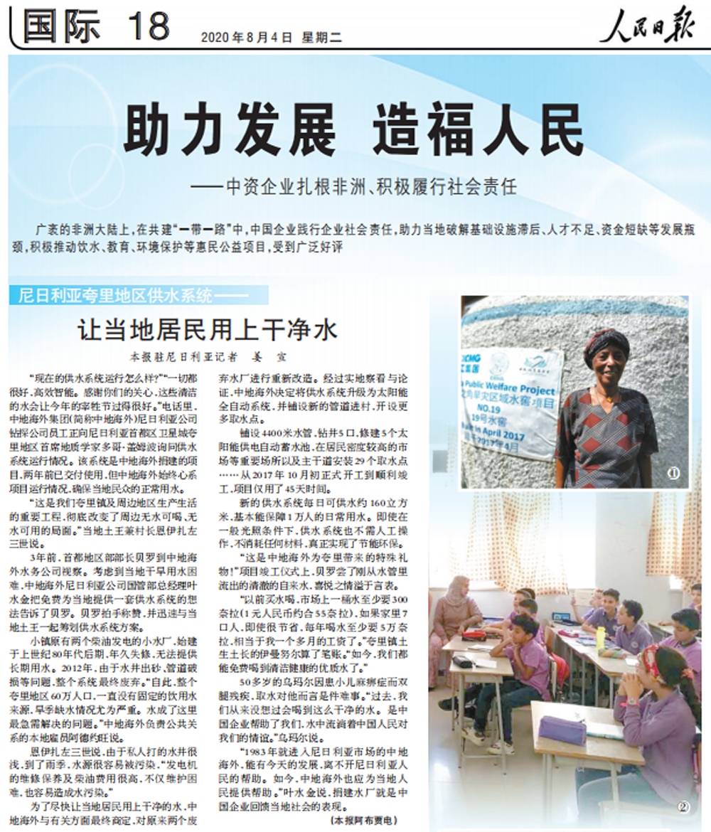 2020年8月4日,《人民日報》第18版“助力發展 造福人民”整版報道了《中資企業扎根非洲、積極履行社會責任》。中國石化新星石油公司所屬中地海外公司捐建的尼日利亞夸里地區供水系統等項目真實反映了中資企業扎根非洲、助力當地破解基礎設施滯后、人才不足、資金短缺等發展瓶頸,積極推動惠民公益項目,受到廣泛好評。